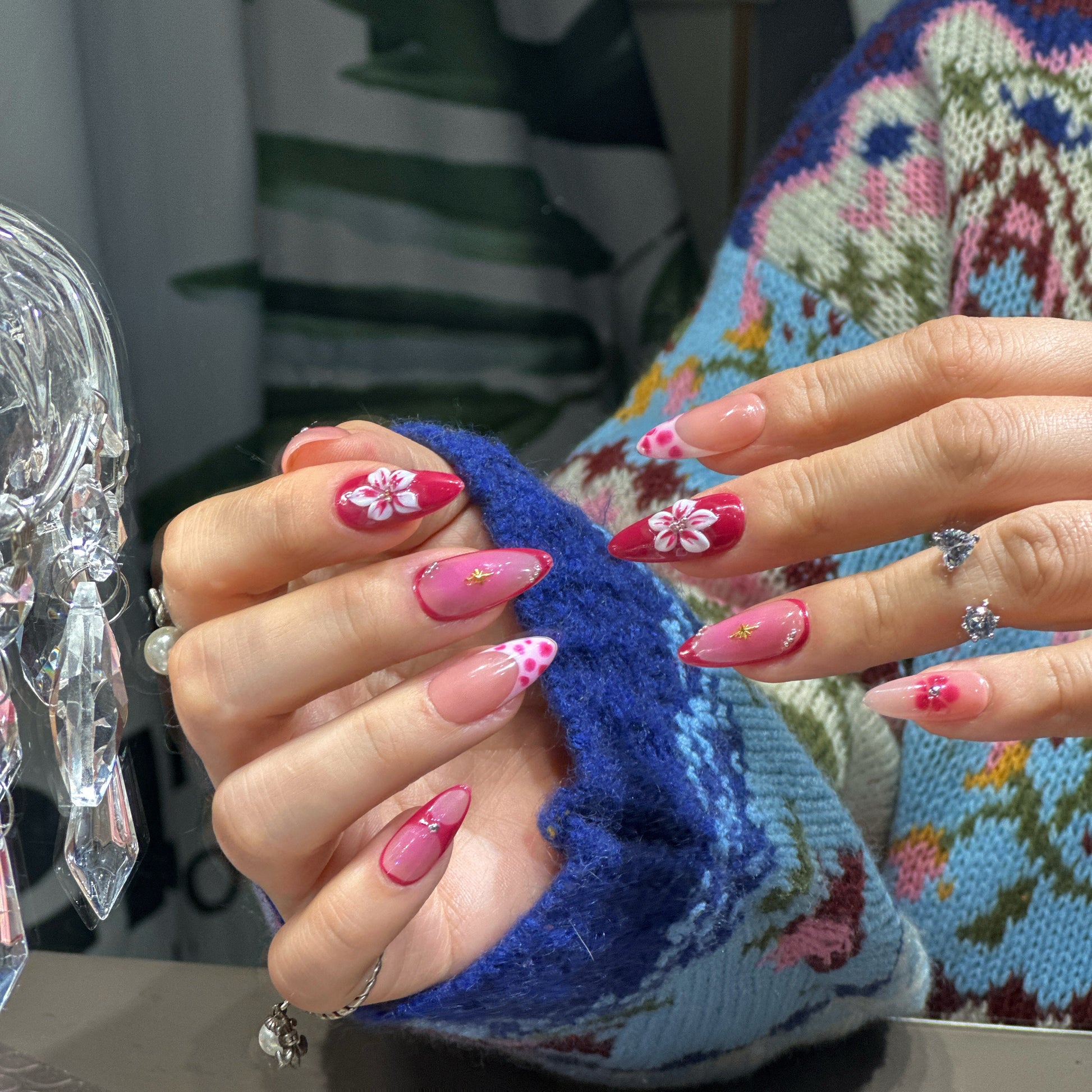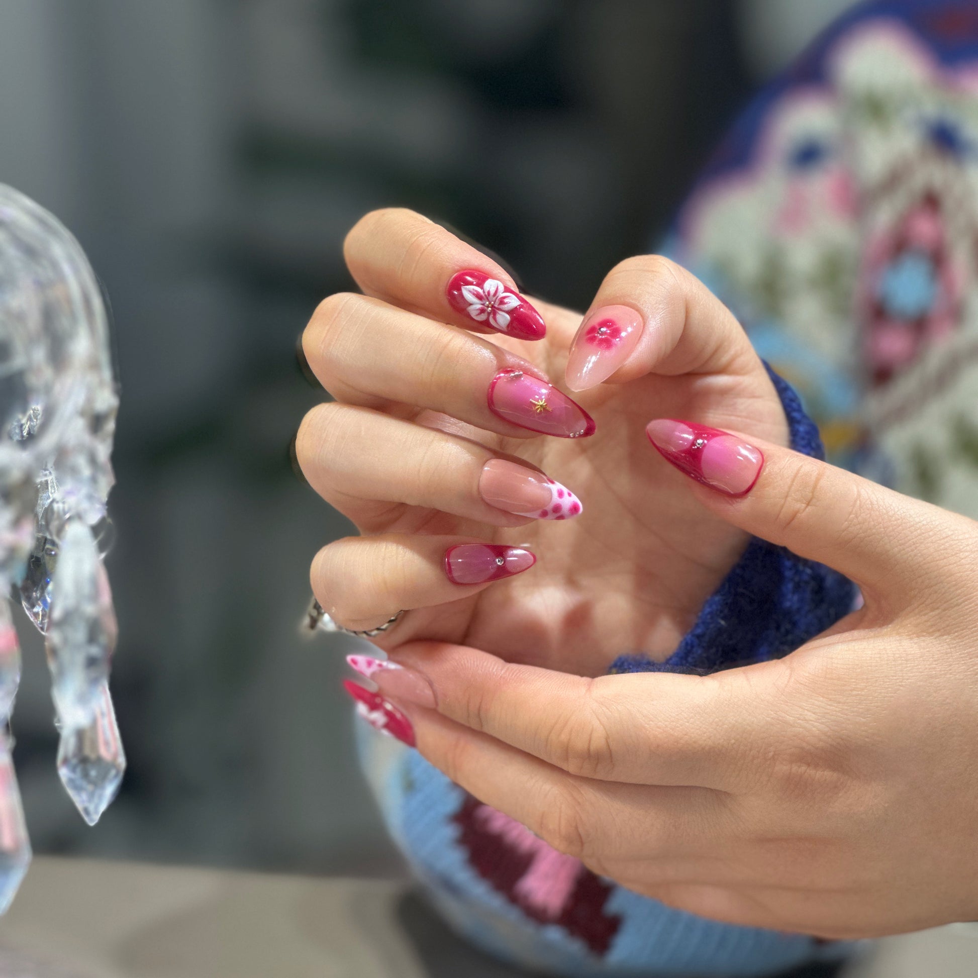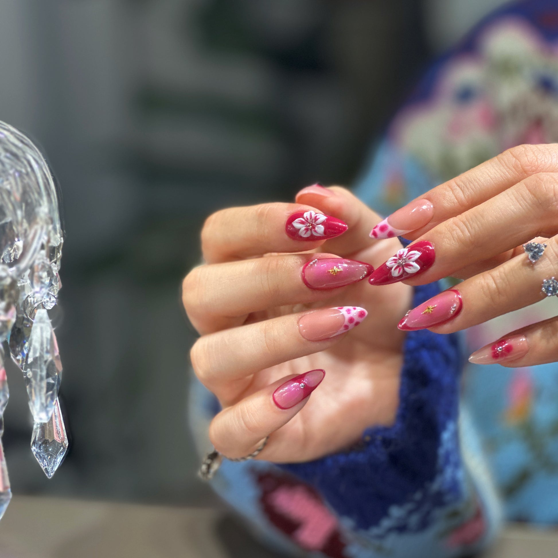 The set features a dreamy deep red/berry aura gradient that gives your nails a natural flush. The centerpieces are the stunning hand-sculpted 3D white flowers and delicate gold star charms. Mixed with playful polka dot French tips, this set is the ultimate romantic accessory.