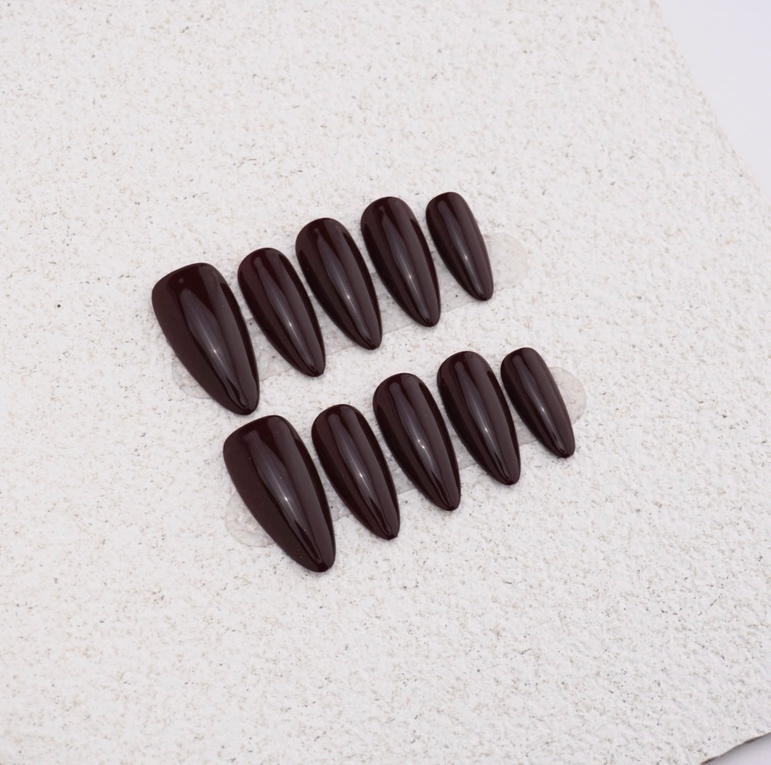 Drenched in a single, saturated hue that blends wine-red depth with chocolate warmth, these nails are crafted for the woman who doesn’t chase trends—she sets them. The high-gloss surface catches light like polished gemstone, while the elongated stiletto shape sculpts your hands into a symbol of quiet authority. No distractions. No compromise. Just pure, unshakable elegance.