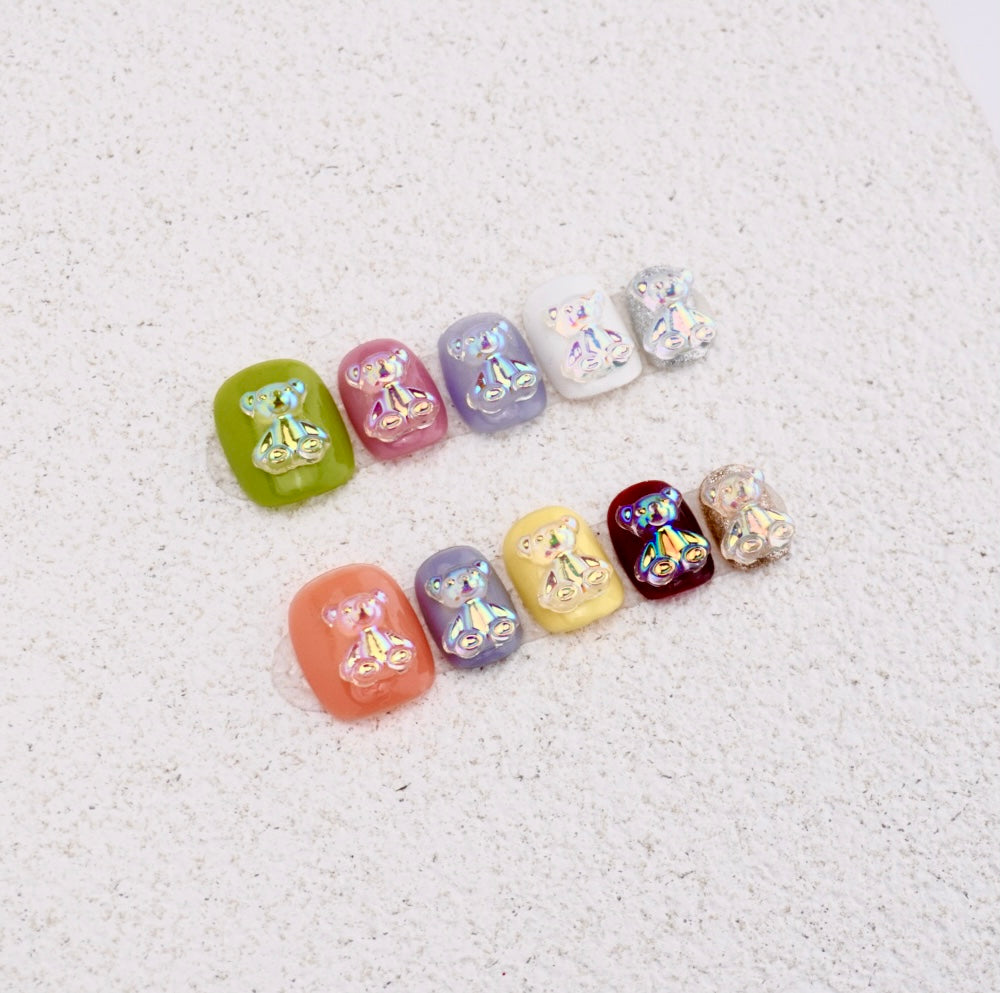 where soft nude, dreamy lilac, vibrant yellow, and deep wine bases shimmer under a high-gloss finish, each crowned with an identical 3D transparent bear head infused with iridescent rainbow glitter, delicate green vines curl like whispered secrets, and micro gold chains add a whisper of luxury—all crafted for those who believe playfulness and polish can coexist.