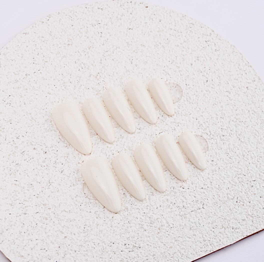Crafted in a single, luminous shade of soft ivory—never stark white, always elegant—these nails embody the quiet confidence of a woman who needs no introduction. The high-gloss finish reflects light like polished pearl, while the elongated stiletto shape sculpts your hands into a statement of modern authority. No glitter. No noise. Just flawless presence.
