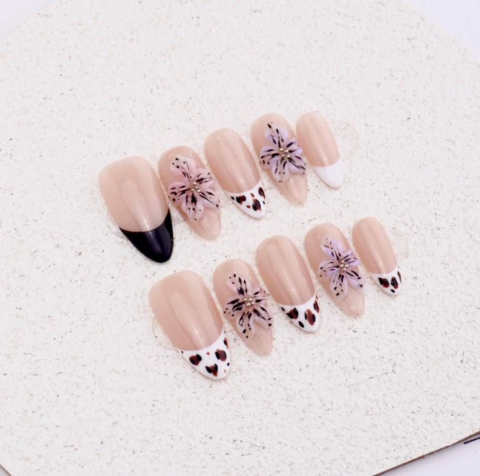 Finish: High Gloss + Mocha Nude Base + Graphic Black/White French Blocks + Leopard-Fleck Accents + 3D Blush & Lilac Lilies + Crystal Centers