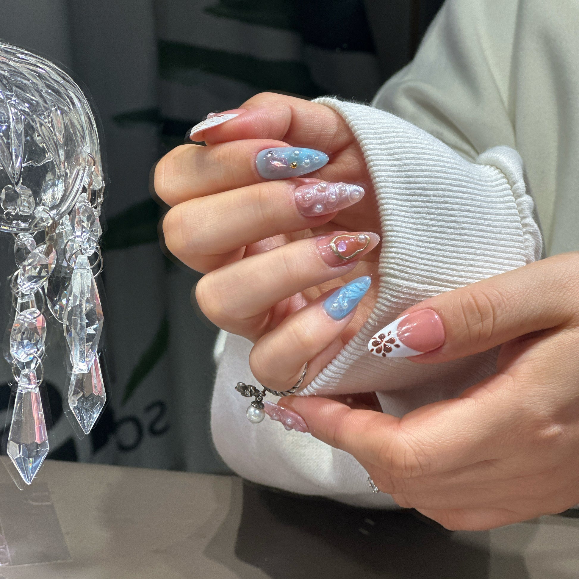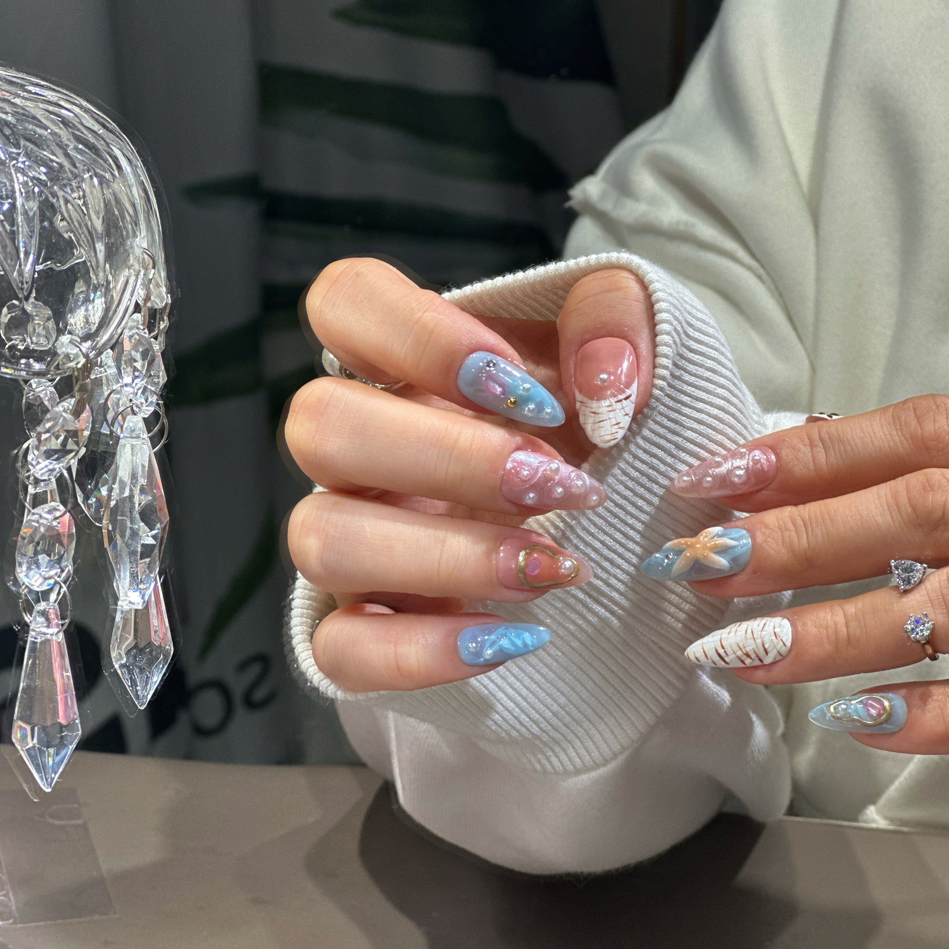 Capture the magic of the ocean with our "Mermaid Pearl" handmade set. This stunning design brings the beach to your fingertips, featuring a dreamy combination of baby blue and nude pink.
