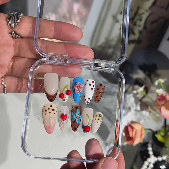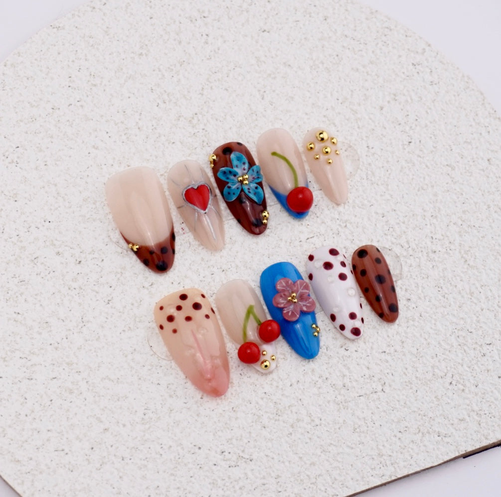 Finish: High Gloss + Blush Pink Base + Crimson French Tips + 3D White Blossoms + Gold Stars + Red Polka Dots
