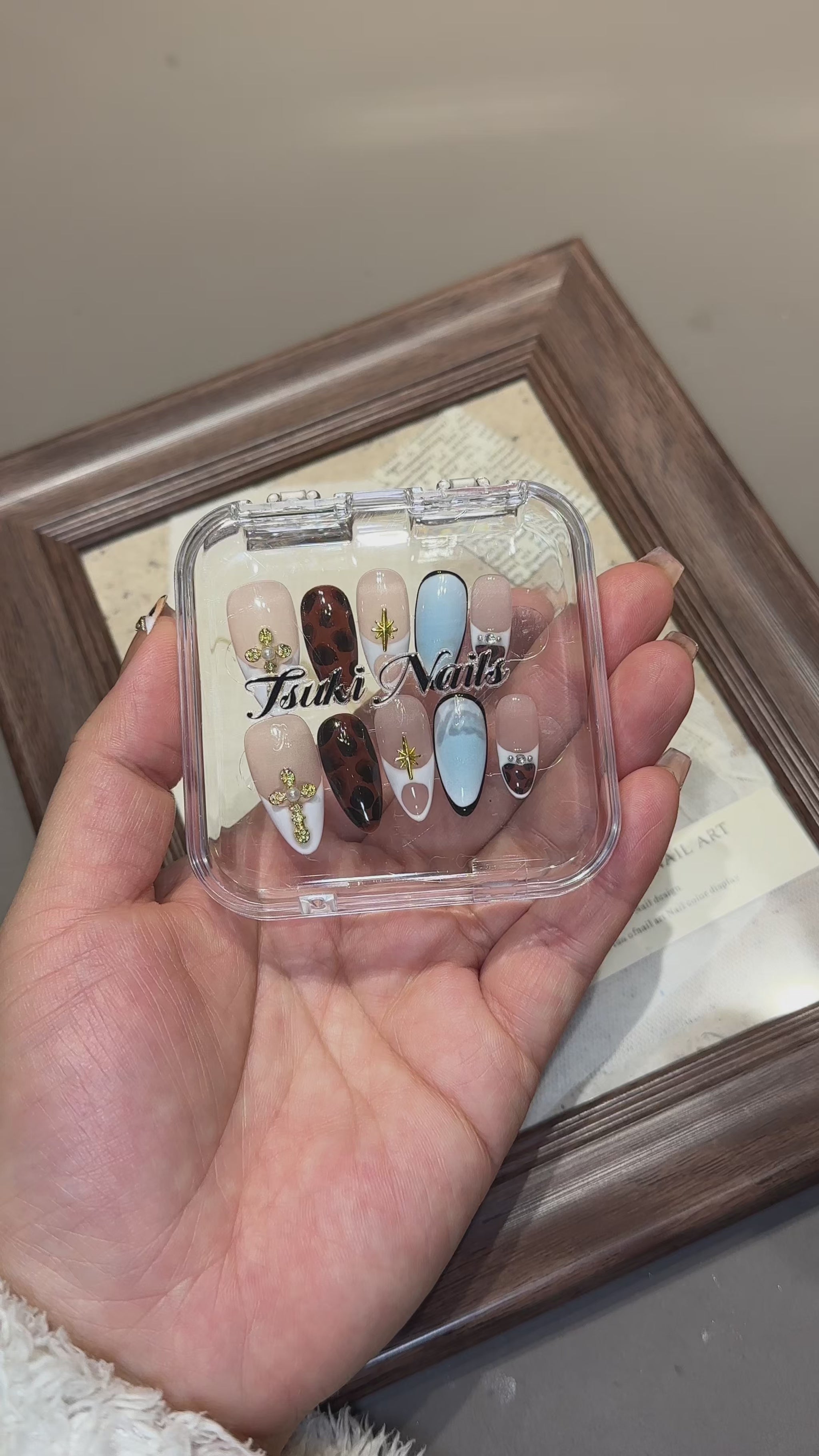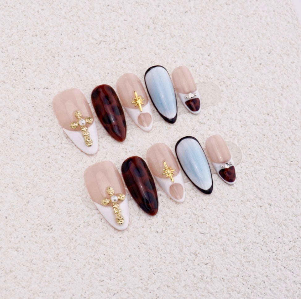 Each stiletto nail balances reverence and rebellion: crisp white French tips frame deep nude bases, while hand-set gold crosses—adorned with micro pearls and clear crystals—anchor the design in quiet faith. Alongside them, authentic leopard print pulses with untamed energy, its amber-and-black rhythm echoing through time. A lone golden star glimmers like a guiding light, and subtle blue ombré gradients whisper of winter skies. The high-gloss finish unifies it all, turning every fingertip into a shrine of contrast.