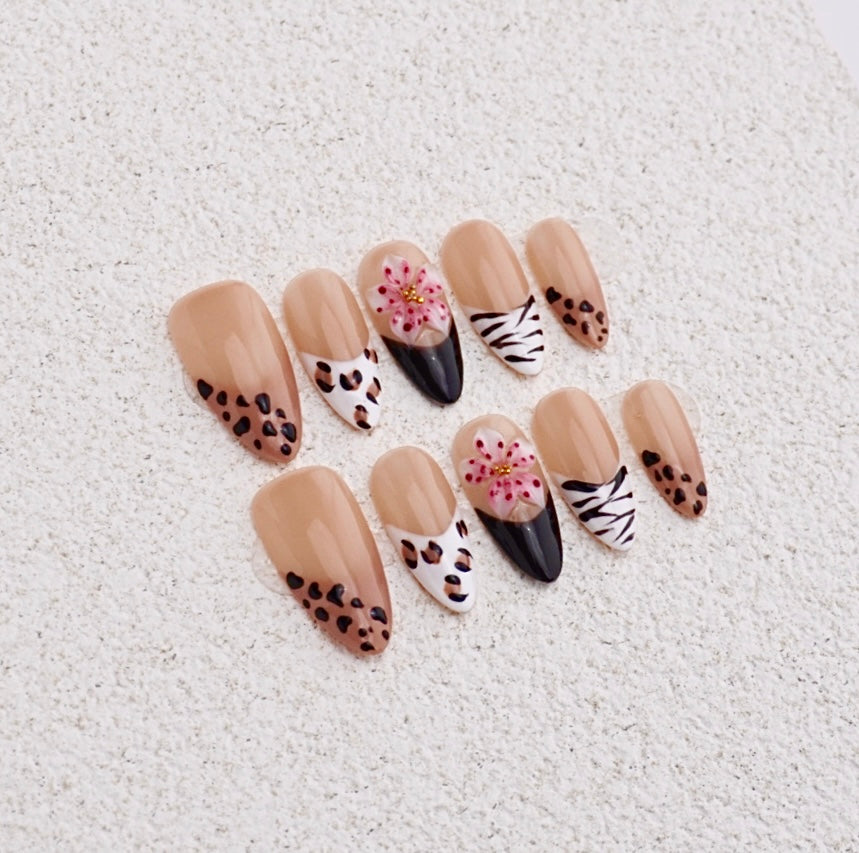 Each stiletto nail walks the line between savanna and garden: one features bold leopard spots in rich amber and black; another pulses with crisp zebra stripes in stark monochrome. Yet amid this primal rhythm, soft pink cherry blossoms unfurl—hand-sculpted petals crowned with golden micro-crystals—like miracles growing in the heart of the jungle. The base glides from nude to deep taupe in a seamless ombré, while classic white French tips anchor the design in timeless sophistication. High-gloss finish amplifies every texture, making fur, flower, and form feel vividly alive.