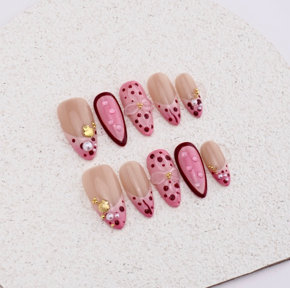 Crafted in an elegant ballerina silhouette, each nail flows from warm nude at the cuticle to deep oxblood red at the tip—creating a natural, romantic gradient that flatters every skin tone. At the center, translucent 3D petals curl like real blossoms, anchored by tiny gold pearls that catch light like morning sun. Scattered red polka dots add playful rhythm, while miniature white pearl dewdrops and golden seashells whisper of spring walks by the sea. The high-gloss finish amplifies depth and dimension, making this set feel both whimsical and refined.