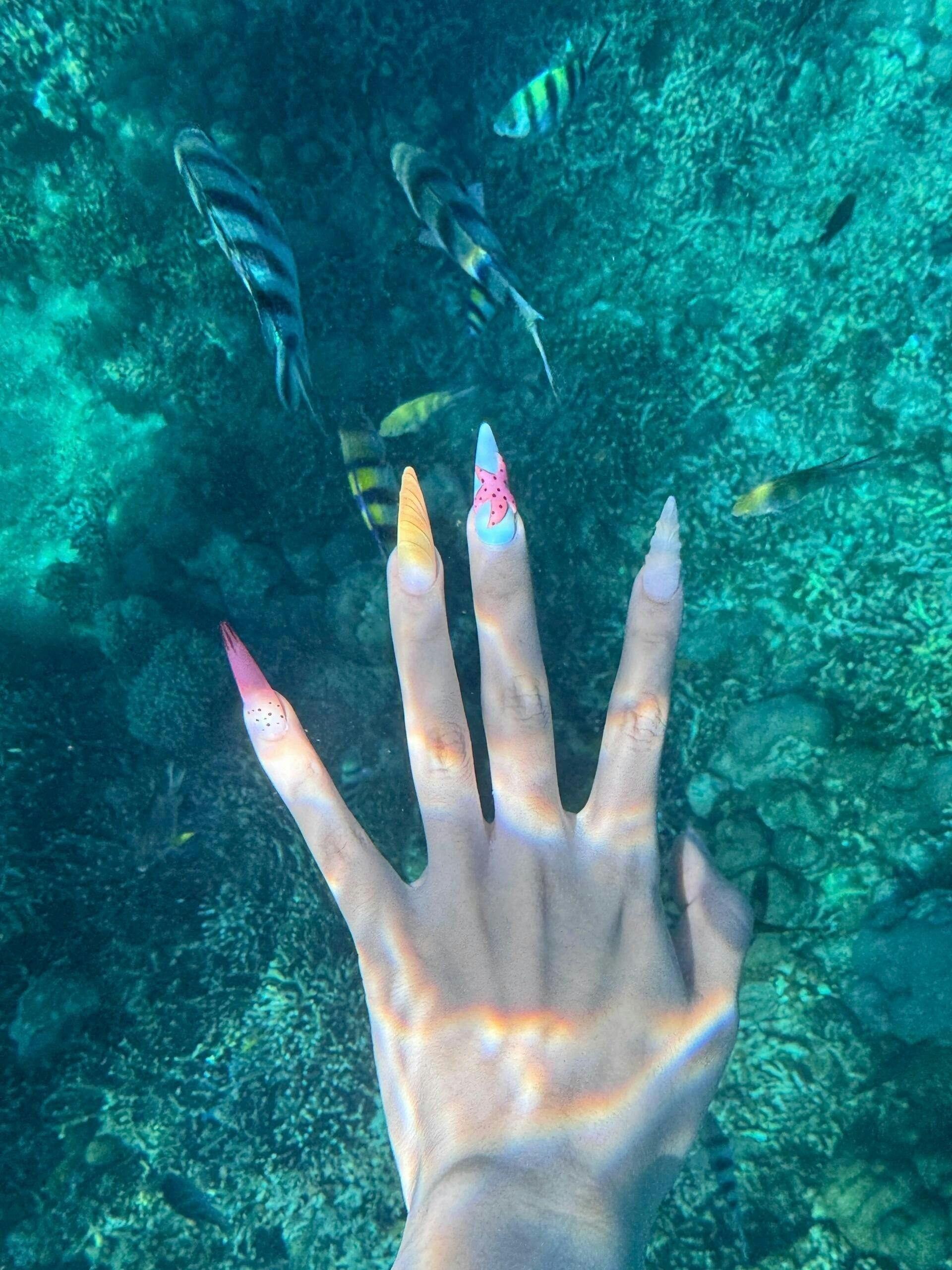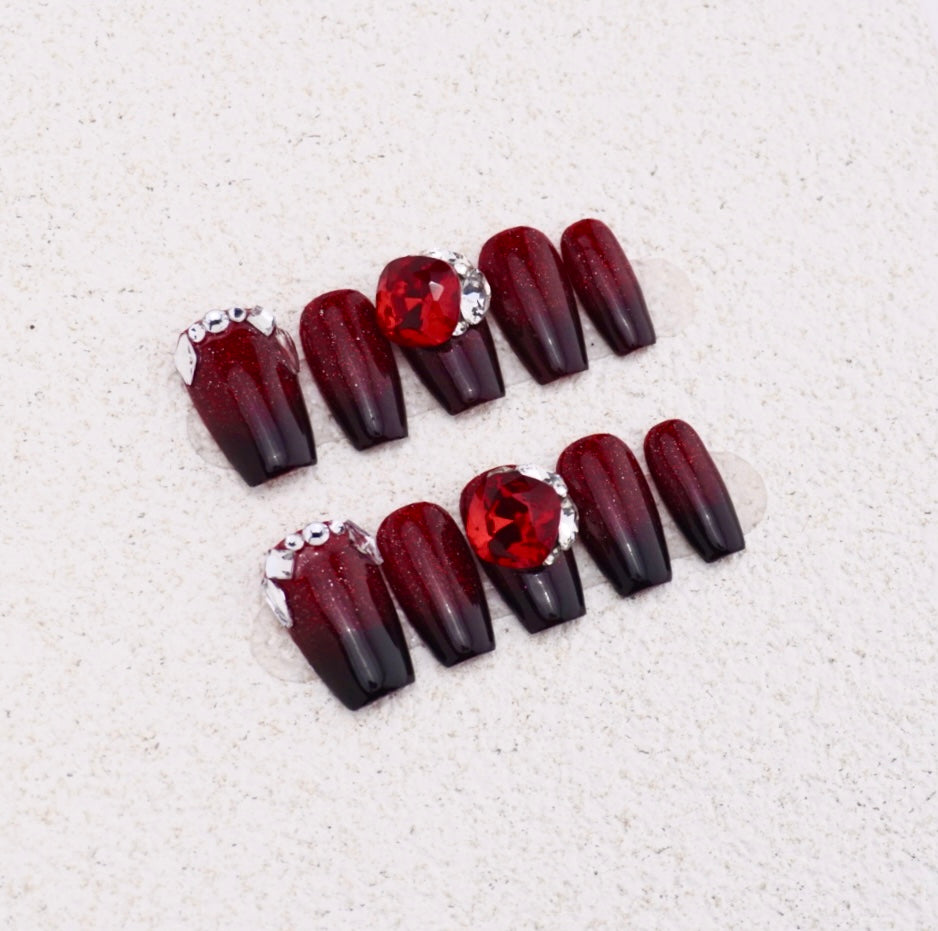 Crafted on a stiletto silhouette for unapologetic presence, each nail features a rich gradient from velvety crimson at the tip to smoky black near the cuticle—layered with fine red glitter that shimmers like crushed rubies. At the heart of every nail rests a bold, faceted red crystal, encircled by micro-clear studs that mimic vintage ring settings. The high-gloss finish amplifies depth, making these nails look freshly lacquered for days.