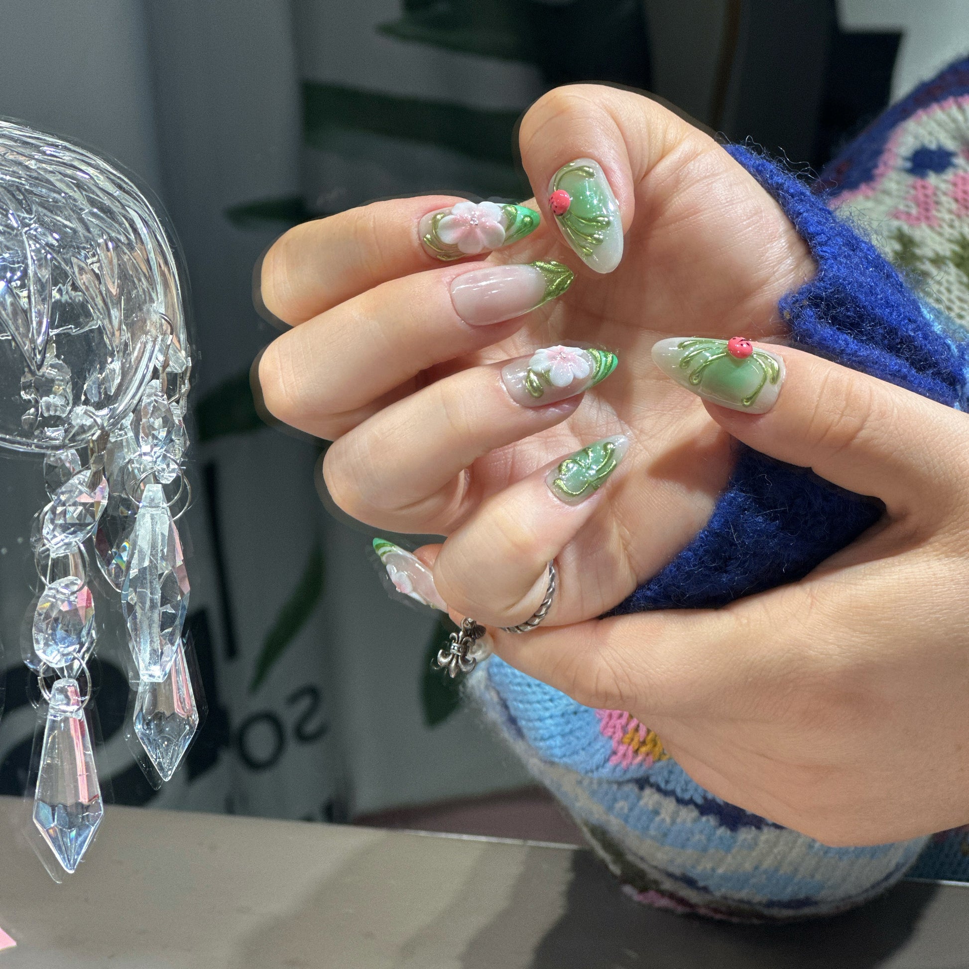 The design features a soft nude base accented with trendy green chrome vines that swirl elegantly across the nails. Delicate 3D pink and white flowers bloom on the tips, while a tiny, adorable red ladybug adds a playful touch to this enchanted look.